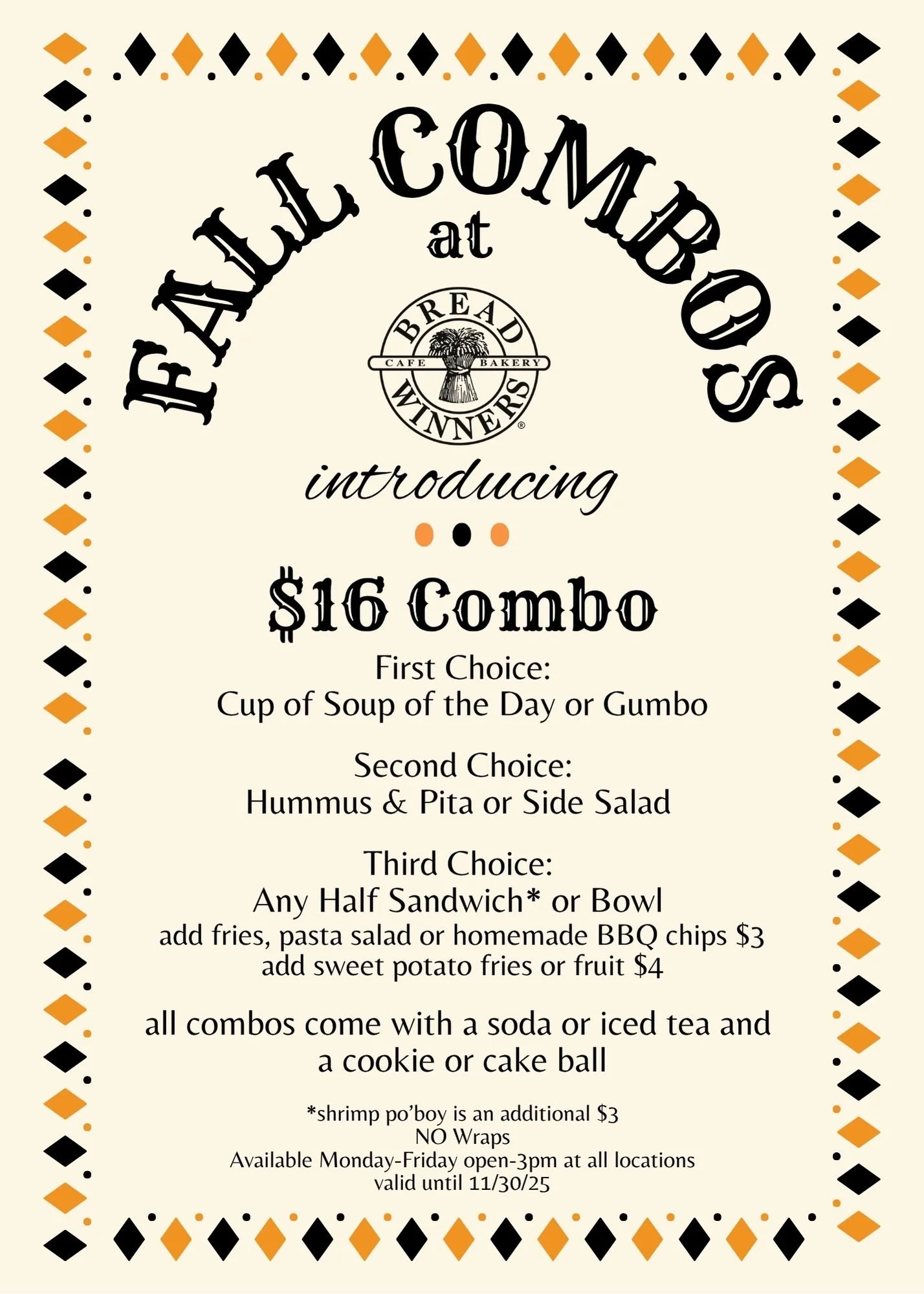 Autumn has arrived at Bread Winners! Warm up with our new Fall Combo Special, featuring seasonal favorites made from scratch. Treat yourself to Halloween-themed pastries — from pumpkin-spiced delights to festive sweets that capture the spirit of the season. And don’t miss Old Fashioned Week, where we’re serving up smooth, timeless cocktails to toast to cooler days and cozy gatherings. Come celebrate the flavors of fall with us — all season long!